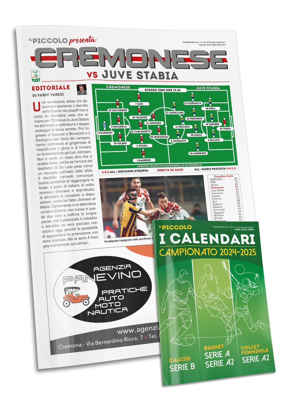 CREMONESE: nato in occasione della ritorno della Cremonese in serie B nel 2017, è distribuito gratuitamente in 3.500 copie allo stadio Zini in occasione delle partite casalinghe. Molto apprezzato e ricercato dai tifosi, anche per la collezione dei poster dei giocatori. I CALENDARI: il Magazine del Piccolo diventa Pocket. Una pratica guida con i calendari delle serie: A e B di calcio, A di basket e A1 di volley, per poter seguire settimana dopo settimana le nostre squadre del cuore. Da consultare e collezionare